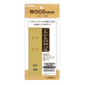 - 3個口 コンセントタップ&USB充電 2ポート 急速充電2.4A 合計1400Wまで M4226 電源 電源タップ スマホ 木目調 トップランド TOPLAND