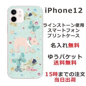 - iPhone12 ケース アイフォン12 カバー ラインストーン かわいい らふら 名入れ 豚 蝶