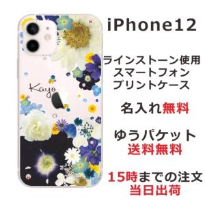 - iPhone12 ケース アイフォン12 カバー ラインストーン かわいい フラワー 花柄 らふら 名入れ 押し花風 フラワーアレンジブルー