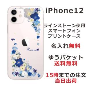 - iPhone12 ケース アイフォン12 カバー ラインストーン かわいい フラワー 花柄 らふら 名入れ 押し花風 ブルーアレンジ