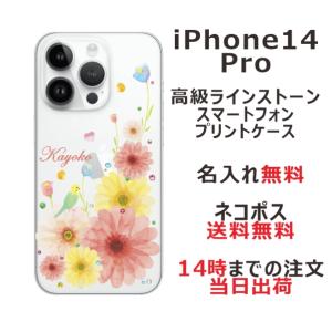 - iPhone14 Pro アイフォン14プロ らふら 名入れ スマホケース ラインストーン ふんわりフラワー インコ
