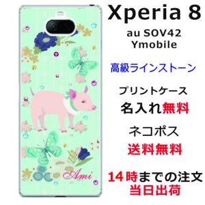 Xperia 8 ケース SOV42 エクスペリア8 カバー ラインストーン かわいい らふら 名入れ 豚 蝶