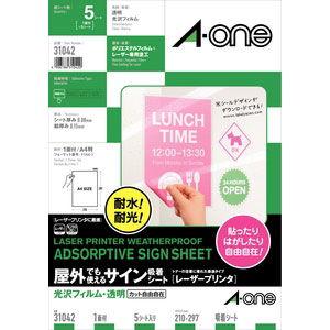 - エーワン レーザープリンタ用吸着シート 屋外でも使える 透明フィルム A4判 ノーカット 屋外でも使えるタイプ吸着シート 31042 返品種別A