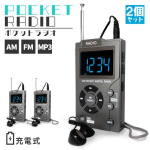 - ポケット ラジオ ポータブル 2台セット MP3プレイヤー ワイドFM FM AM 対応 イヤホン ストラップ付き 音楽プレイヤー 充電式 時計 ミニ
