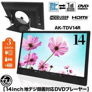 - ポータブルDVDプレーヤー 14インチ 地デジ番組録画機能 3電源対応 3スタイル HDMI入力端子 AVケーブル付属 CPRM/VRモード対応 AK-TDV14R