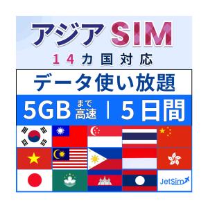 【アジア14ヵ国物理SIM】5日間 5GB 高速データ ジェットシム アジア旅行 データSIM ジェットシム JetSim テザリング可 5G/4G-LTE 1日1GBまで高速