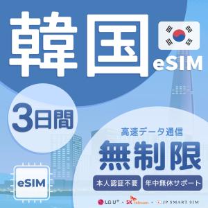- 【メール送付】韓国eSIM 3日間 無制限 韓国SIM プリペイドSIM データ使い放題 4G/LTE回線 データ通信専用 esim対応simフリー端末のみ対応