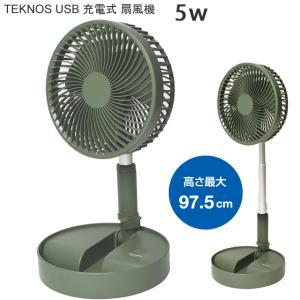 - USB 充電式 コンパクト扇風機 折りたたみ収納扇 羽根径15cm 風量3段階切替 上下角度調節 リズム風モード TEKNOS SI-002UG (モスグリーン)