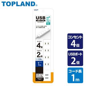 - トップランド USB-A×2ポート 電源タップ 4個口 2m(ホワイト) TOPLAND STPA420-WT 返品種別A