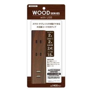 - トップランド USB 電源タップ 雷ガード コンセント2個口 USBポート2個口 延長コード 1.5m 木目調コード オートパワーシステム搭載