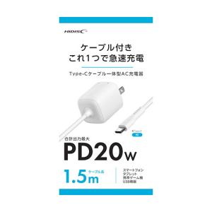 - HIDISC PD20W対応 Type-Cケーブル一体型AC充電器 充電コード忘れの心配なし ホワイト 取り寄せ商品