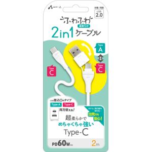 - エアージェイ USB変換アダプタ付 Type-C-Type-C ふわふわ 2in1ケーブル 2m(ホワイト) air-J CCJ-CA2MWH 返品種別A