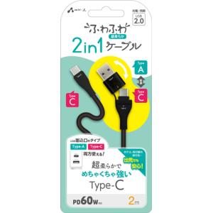 - エアージェイ USB変換アダプタ付 Type-C-Type-C ふわふわ 2in1ケーブル 2m(ブラック) air-J CCJ-CA2MBK 返品種別A