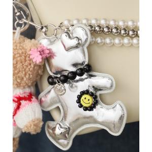 パールチャーム付き フェイクレザー ベアキーホルダー