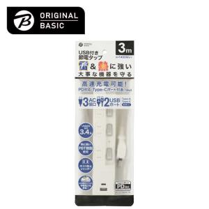 - ORIGINALBASIC USB付き節電タップコード有りType-C付 [3.0m /3個口 /スイッチ付き(個別) /2ポート] 白 OBB-TPK331AC-W