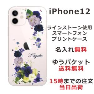 - iPhone12 ケース アイフォン12 カバー ラインストーン かわいい フラワー 花柄 らふら 名入れ 押し花風 ブルーアレンジ