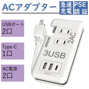 iPhone/スマートフォン充電 ポータブルコンセント ミニ型 USBポート付 USB2+Type-C1ポート ホワイト おしゃれ 2個AC口 3個USBポート