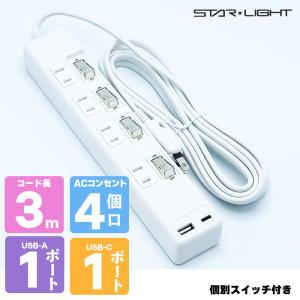 【4個口 + 2USB】個別スイッチ付き電源タップ 3m 【3m】